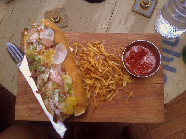 Their menu, which might not be the most famous thing right now (alcohol is more popular), is made up of gourmet hot dogs. Gourmet hot dogs. There were about 15 or so yummy-reading items. I had the 'Aloha' with chilli, pineapple, bacon, onion and some other deliciousness I can't quite recall at this moment. (Yes, I should have blogged it sooner)